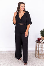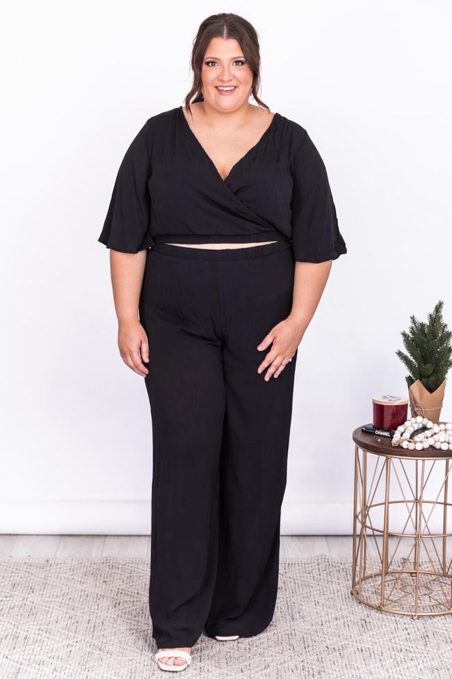 This cute black wrap blouse will be adorable for any afternoon out! We love the flowing flutter sleeves and classic v-neckline. This will be your new fav all season long. It also features a lightweight feel and cropped style. Pair this blouse with a skirt or the matching pants for a cute outfit!